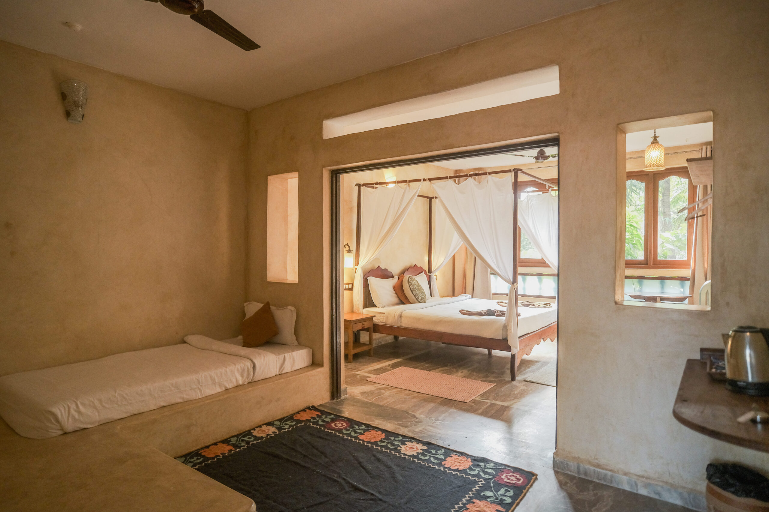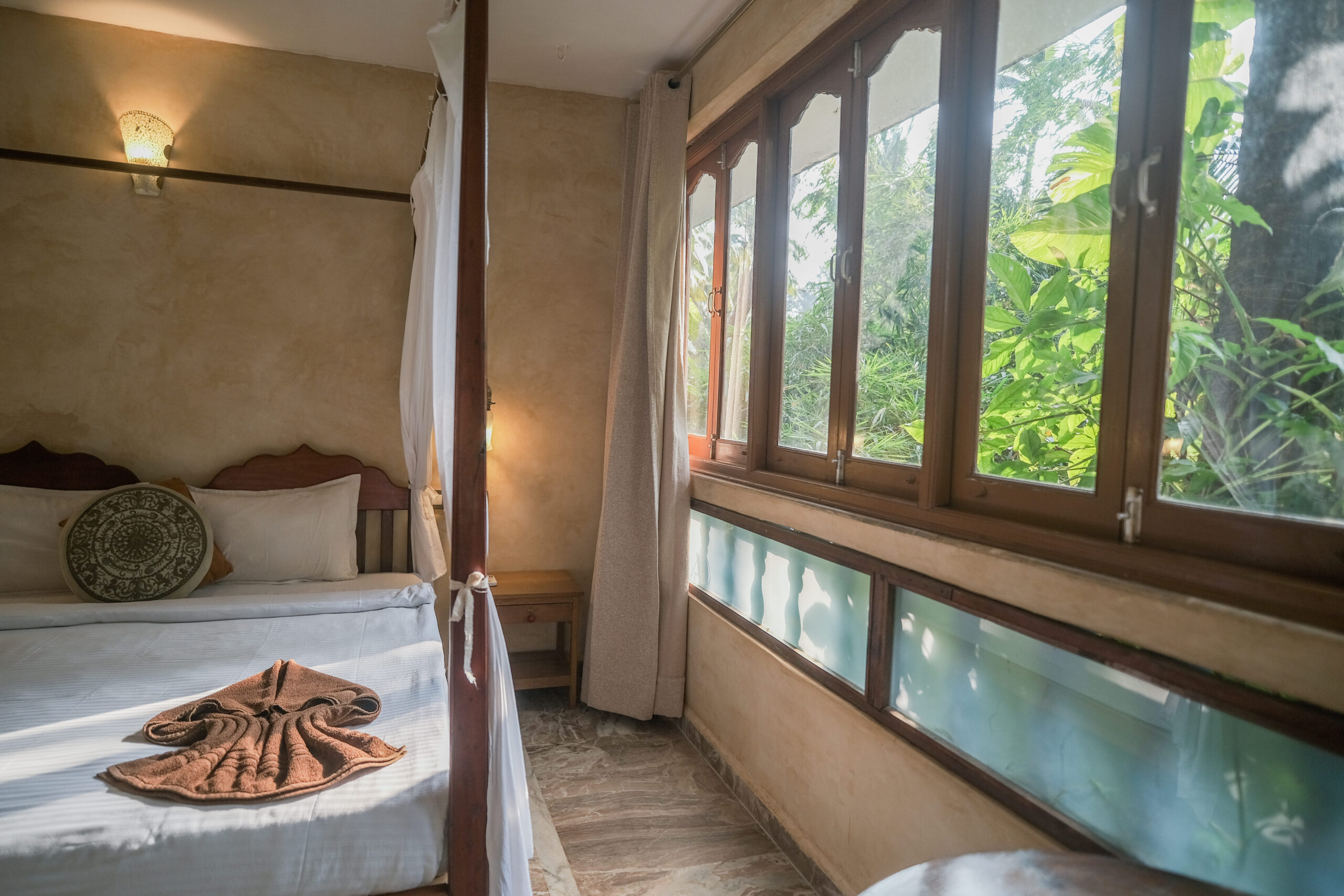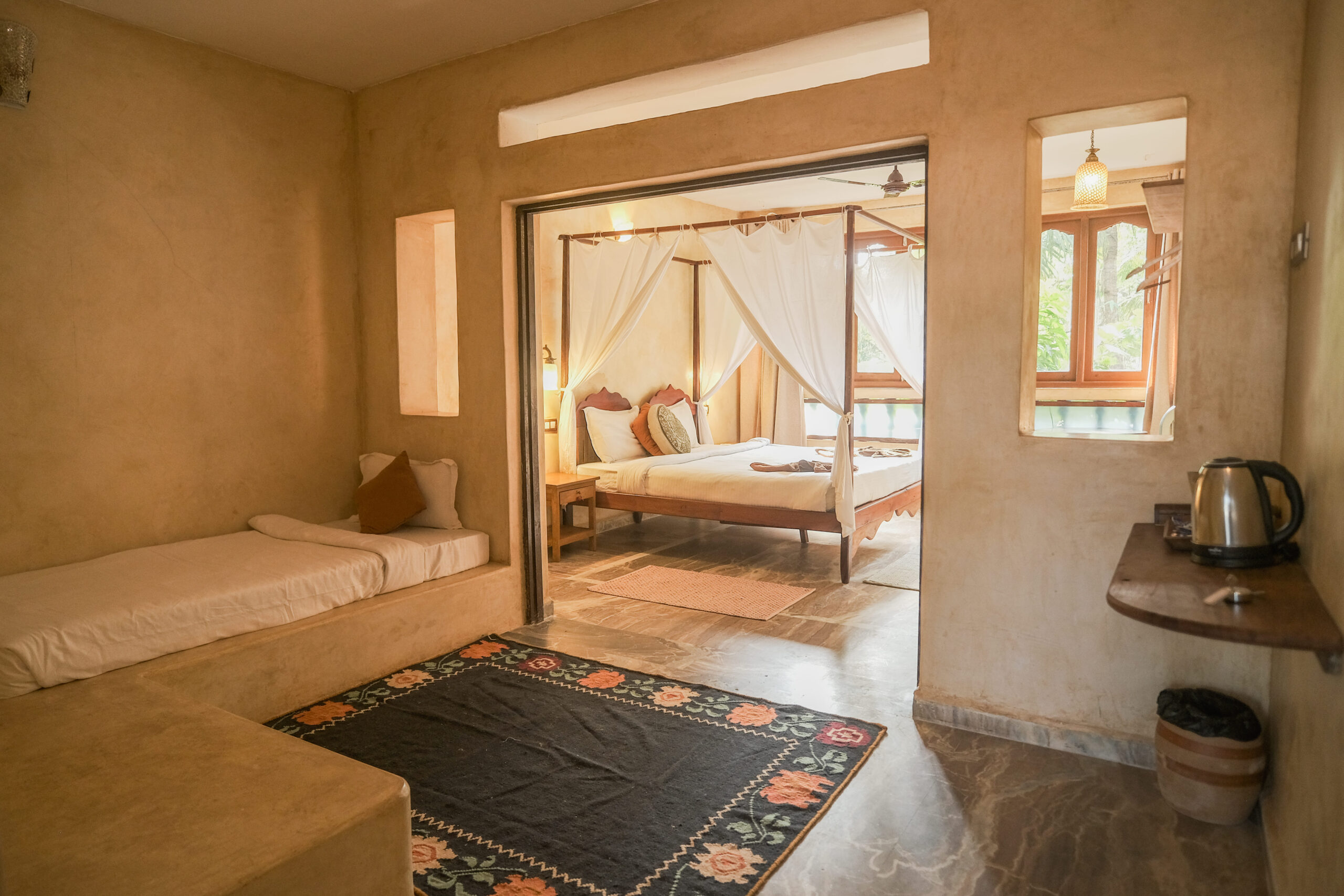 Set amidst lush tropical greenery and swaying palms, each room features handcrafted interiors, rich fabrics, and traditional Rajasthani accents. Thoughtfully designed with expansive windows and airy balconies, they invite in natural light and fresh ocean breeze. A comfortable double bed, a sofa bed, a private bathroom, and air conditioning ensure a restorative and peaceful stay—an essential part of any Goa retreat centre or wellness journey.