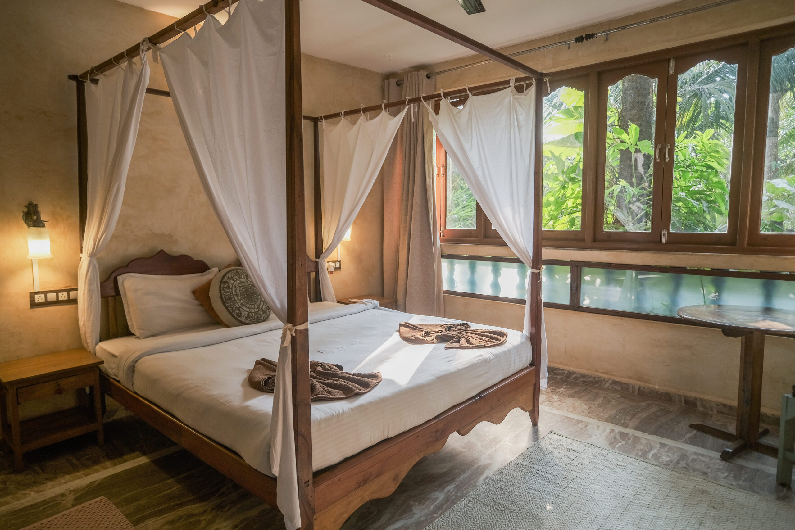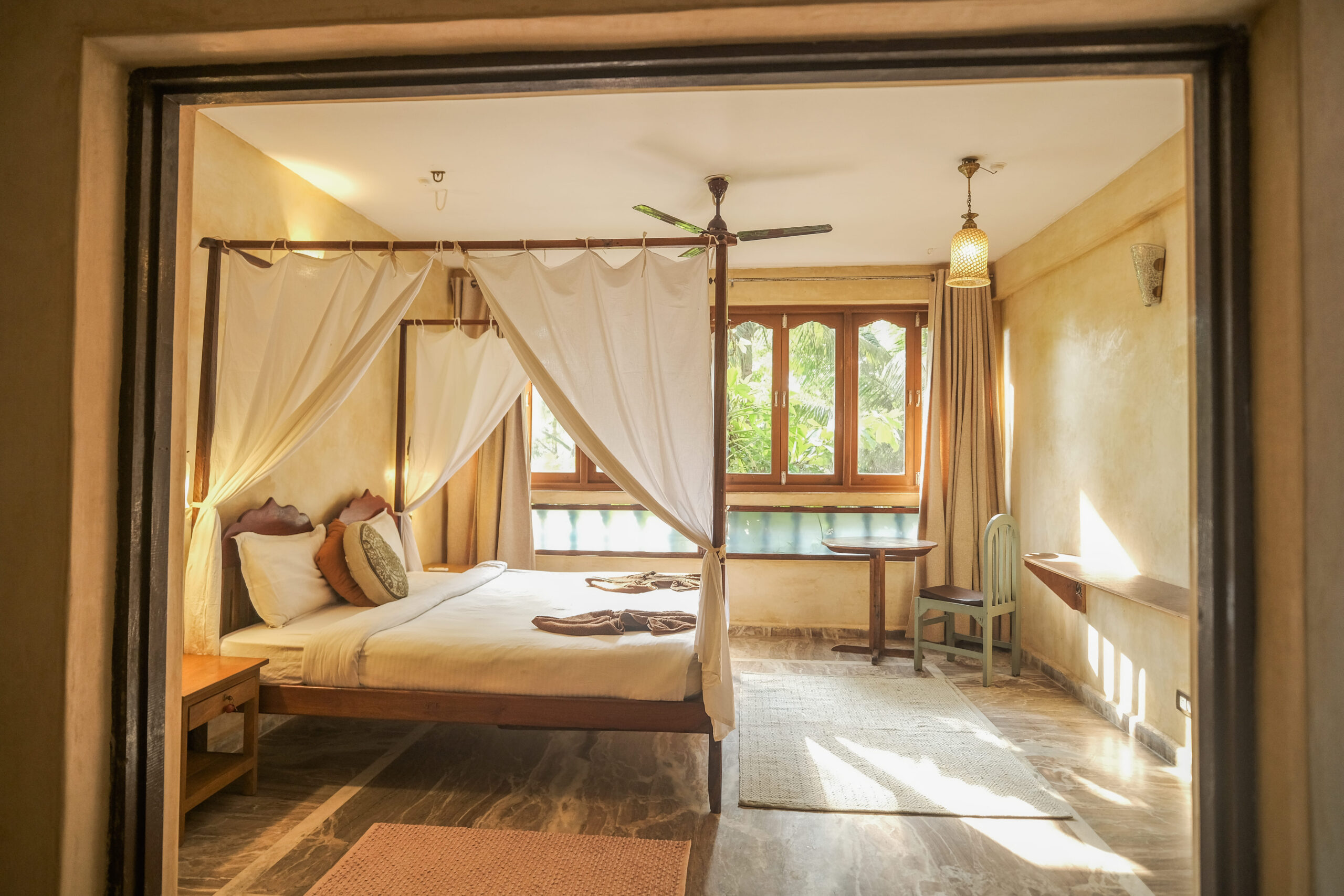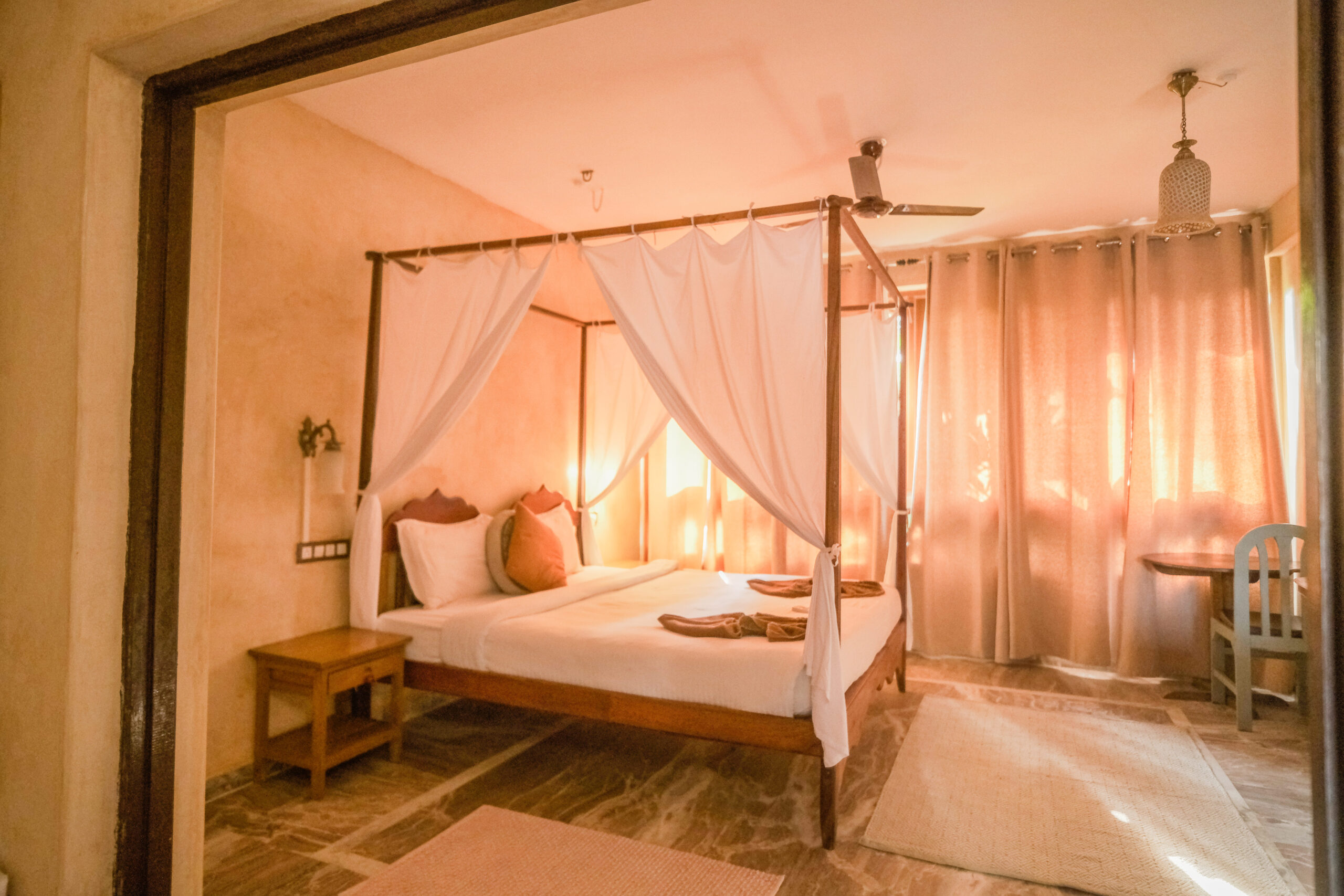 Set amidst lush tropical greenery and swaying palms, each room features handcrafted interiors, rich fabrics, and traditional Rajasthani accents. Thoughtfully designed with expansive windows and airy balconies, they invite in natural light and fresh ocean breeze. A comfortable double bed, a sofa bed, a private bathroom, and air conditioning ensure a restorative and peaceful stay—an essential part of any Goa retreat centre or wellness journey.